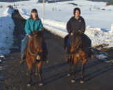 Foggy Hollow's Elvira (near) and Leigh Ann with Ember (far), on trail ride in the Bitteroot Mountains. Photo taken by Cary.