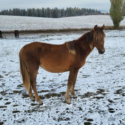 Rita is by our stallion Marty. She has always loved to be with people and is so easy to handle we had our 8 year old son giving her halter lessons as a foal. She has the long forelock and mane classic look.